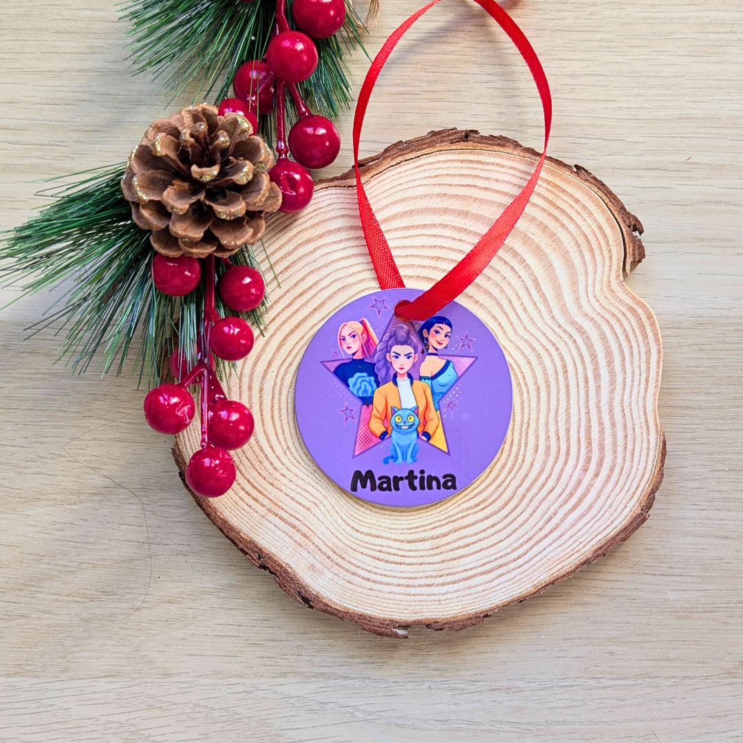 Haz que la Navidad de las más pequeñas sea mágica con nuestro adorno especial de las cantantes Huntrix- Kpop diseñado para niñas que adoran la música y la fantasía. Personalizado por una cara con el nombre de la niña, este adorno se convierte en un detalle único que llenará de ilusión el árbol navideño. Fabricado con materiales de alta calidad y un diseño encantador, es perfecto no solo para decorar durante las fiestas, sino también para usar como accesorio decorativo en su habitación o mochila durante todo el año. ¡Un regalo lleno de estilo, color y diversión que hará brillar su Navidad!