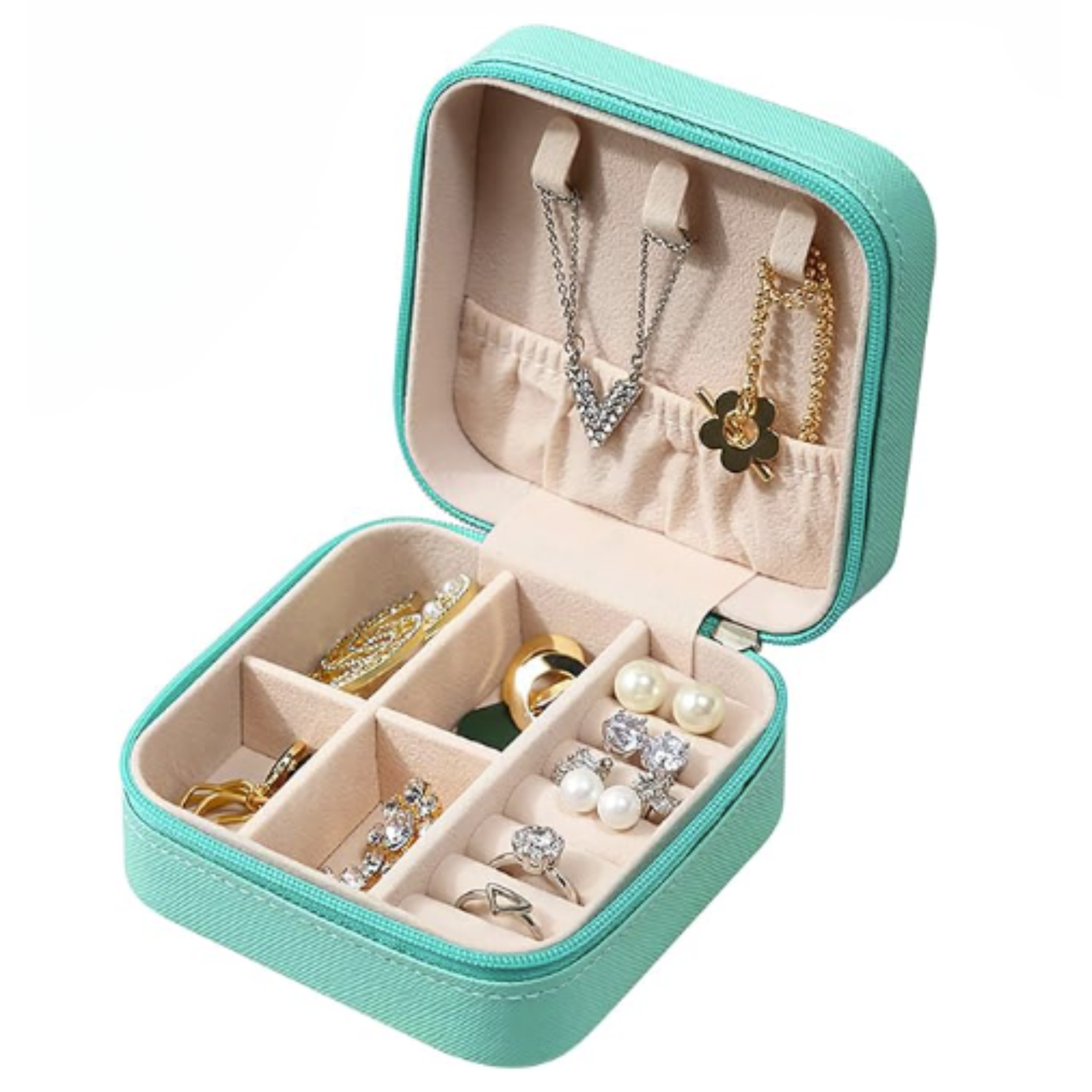 - Interior suave y compartimentos para anillos, pendientes y collares