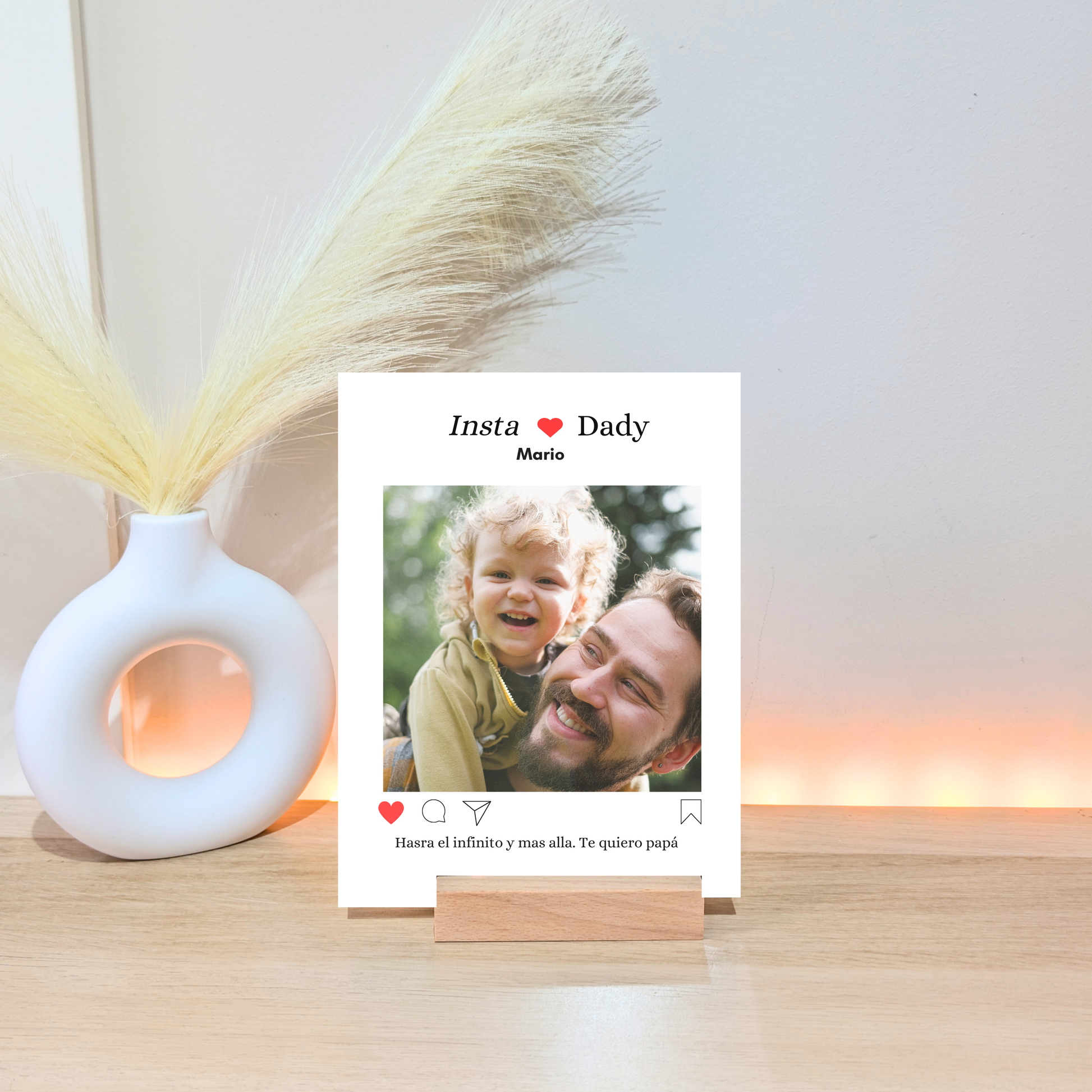 Sorprende a papá con Insta Dady, una placa personalizada que recrea un post de Instagram con su foto favorita. Un detalle único y emotivo para recordarle cuánto lo quieres. Personaliza la imagen, el texto y los detalles para hacer un regalo inolvidable.