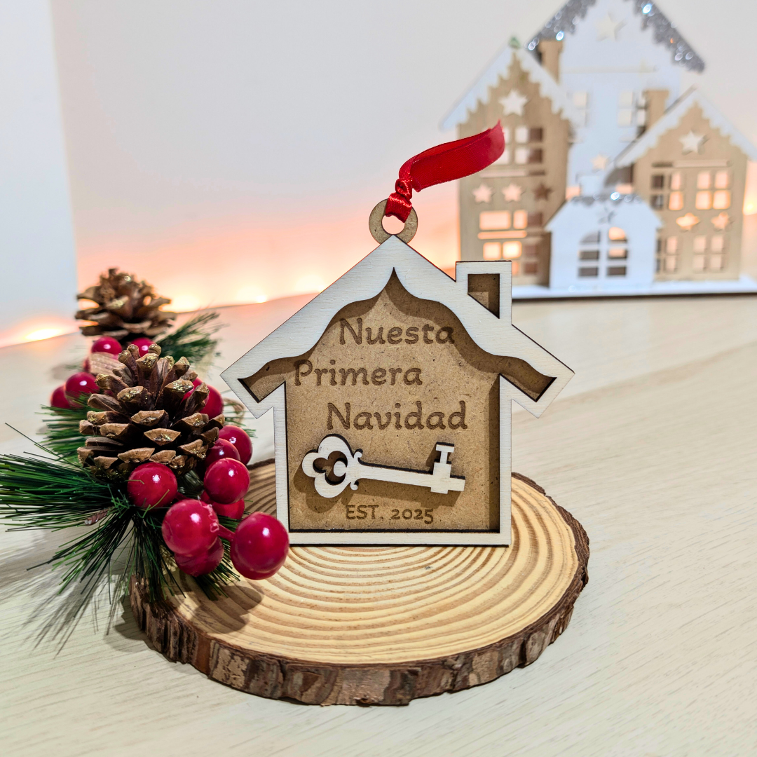 Celebra un momento único con este adorno navideño de madera en forma de casita, perfecto para conmemorar nuestra primera Navidad juntos. Fabricado en madera natural y grabado con detalle, puedes personalizarlo con vuestras iniciales o el año de vuestra primera Navidad. Ideal como regalo especial para parejas, recién casados o nuevas familias. Un detalle cálido, original y hecho para durar.