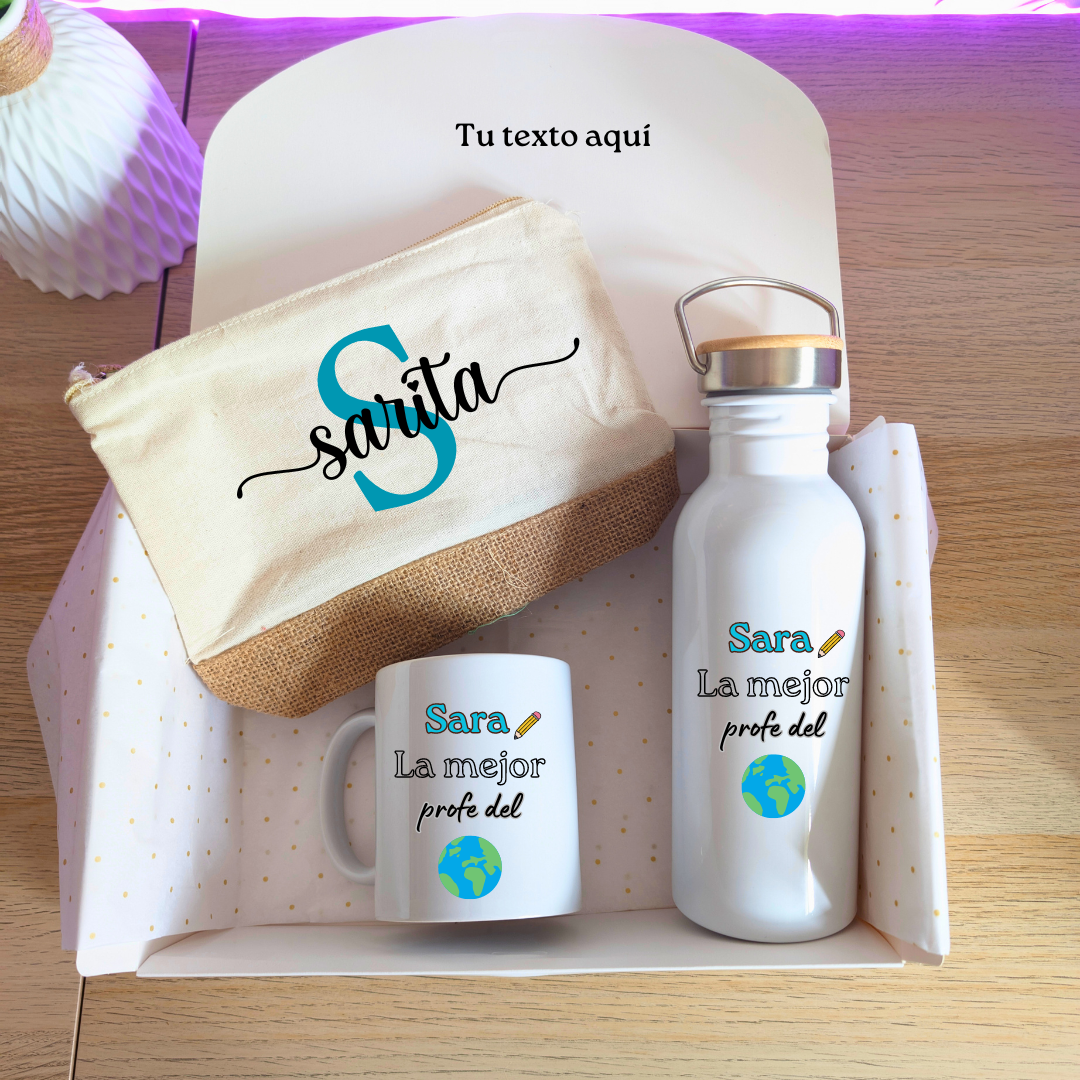 La Cajita es el regalo perfecto para agradecer a tu profe. Incluye una botella, taza, neceser y una dedicatoria personalizada en el interior. Sorprende a tu profe con este detalle único y demuéstrale tu agradecimiento de una manera especial.