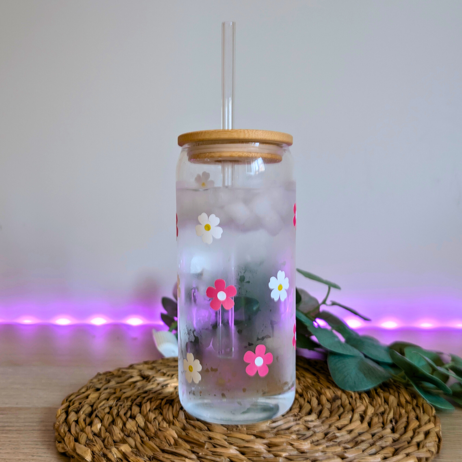Vaso de cristal de 500 ml con tapa de bambú y pajita de cristal.