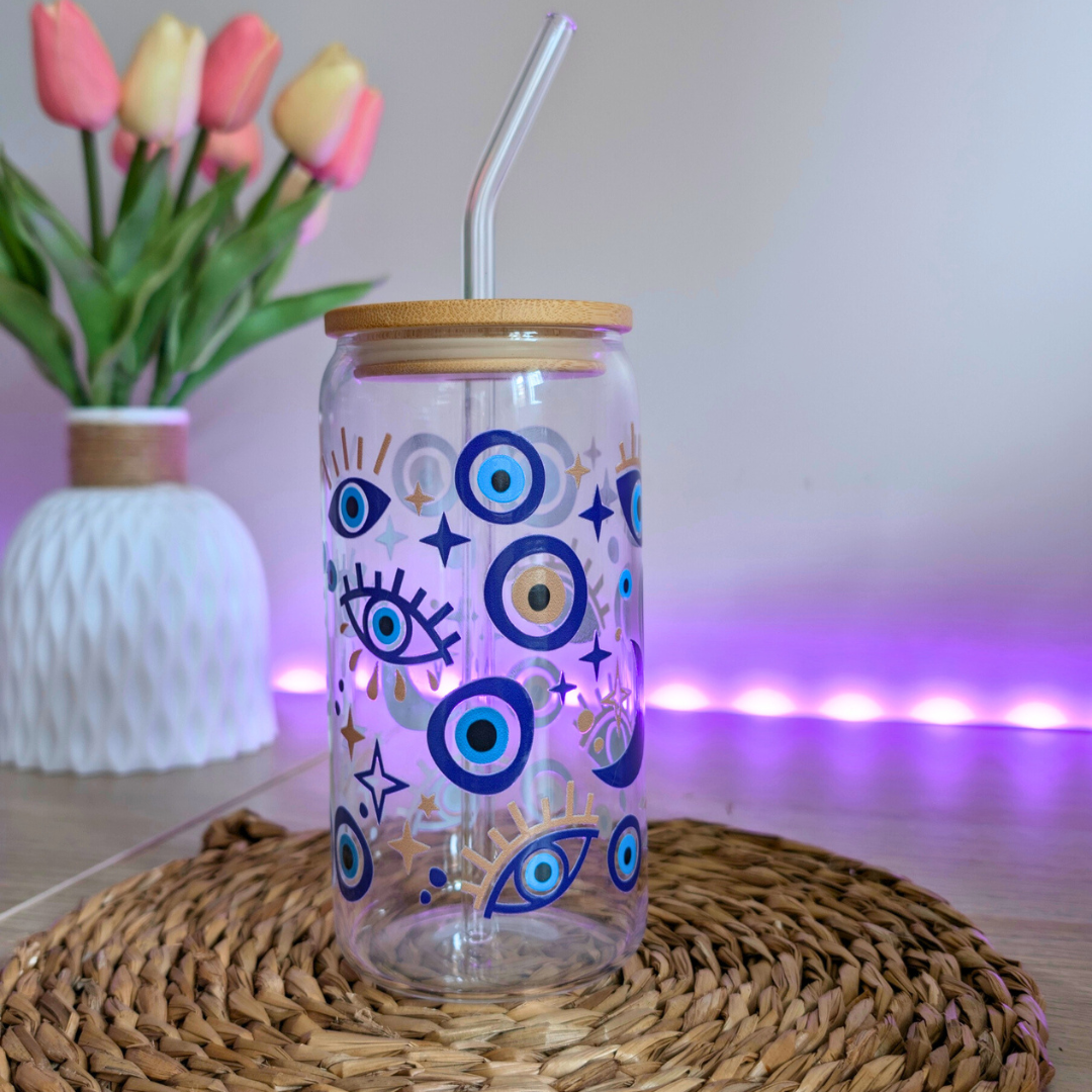 Vaso de cristal de 500 ml con tapa de bambú y pajita de cristal.