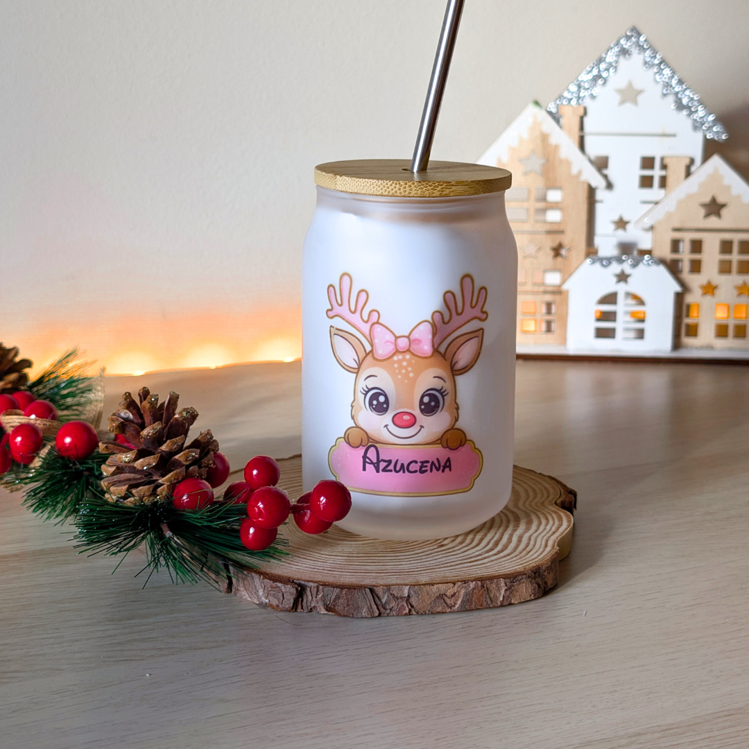 Vaso de cristal con tapa de bambú y pajita metálica. Personalízalo con tu nombre, Ideal para ti o regalar en estas navidades